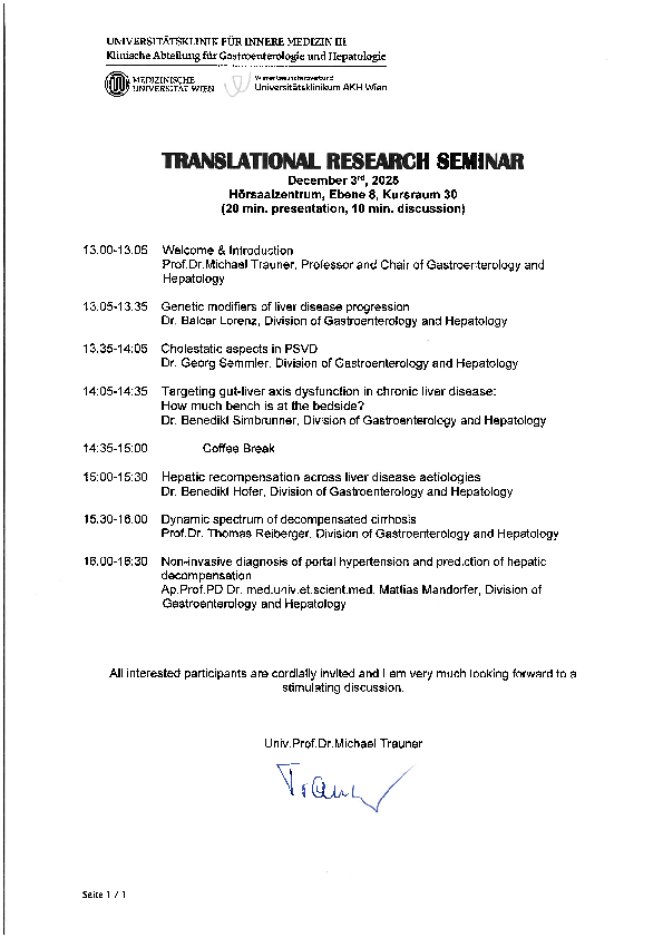 Professor Trauner is pleased to invite you to the Translational Research Seminar of the Clinical Division of Gastroenterology and Hepatology. Everybody is most welcome - Prof. Trauner is looking forward to lively discussions.