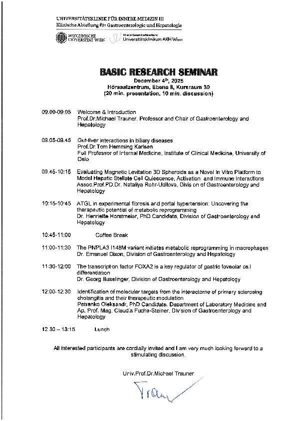 Professor Trauner is pleased to invite you to the Basic Research Seminar of the Clinical Division of Gastroenterology and Hepatology. Everybody is most welcome - Prof. Trauner is looking forward to lively discussions.